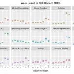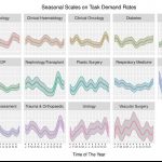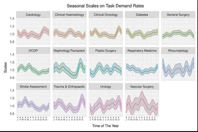 Have a look at the two figures above – you will find a bunch of colourful graphs showing what are seemingly temporal patterns distributed across various medical disciplines. The technical name to these is “Bayesian posterior credible intervals” – on a basic level, this is simply Bayesian analogue to a confidence interval, a.k.a. our favourite concept in that dreaded Year-1 statistics class. These ones reflect variations on average patterns of task demand in the hospitals, both weekly and year-round. Most importantly, these are not descriptive results, i.e. they don’t just average data here and there, nor are they built on strong assumptions common in practical low-level models. These results are extracted from a model of high complexity accounting for day-to-day dependence, random noise, distribution of observations … and the outputs reflect uncertainty regarding our confidence in the scales. So, why is this important? Why did the RCP or other physicians care? After all, they are nothing but confidence intervals, they tell us nothing for sure!